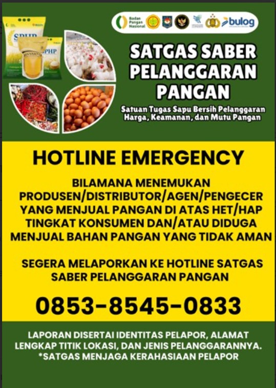 Hotline ini dibuka sebagai bagian dari penguatan pengawasan harga dan mutu pangan yang dilakukan secara nasional. Setiap laporan masyarakat akan ditindaklanjuti oleh Satgas Saber yang bekerja serentak di seluruh wilayah Indonesia.