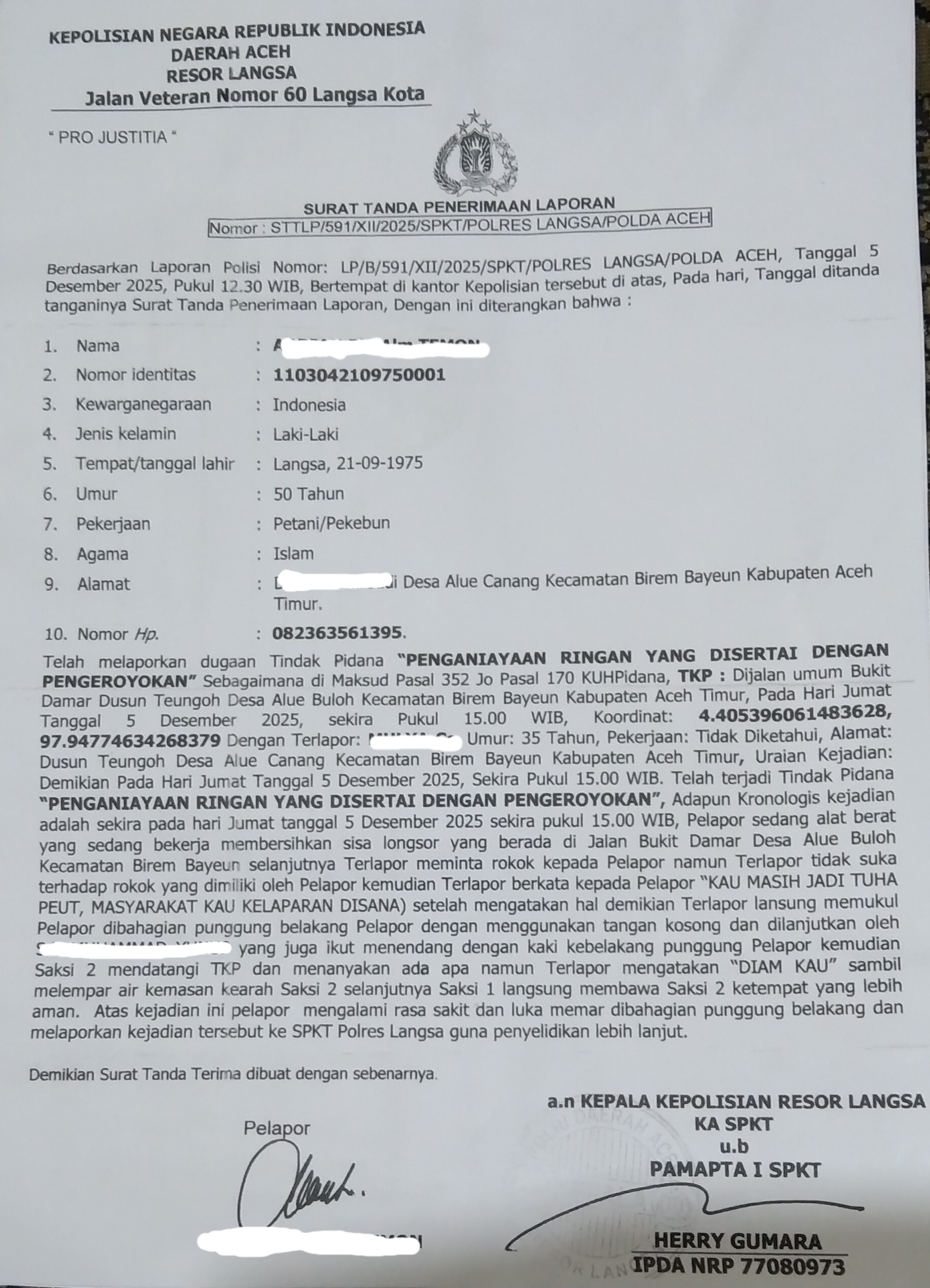 Birem Bayeun |detektifinvestigasigwi.com- Sesuai atas adanya lembaran laporan polisi, yang sempat di terima oleh wartawan media ini. Senin 15/12/2025, sekitar pukul.11.30.wib, dengan surat tanda penerimaan laporan. Nomor : STTLP/591/XII/2025/SPKT/POLRES LANGSA/POLDA ACEH, berdasarkan laporan polisi nomor : LP/B/591/XII/2025/SPKT/POLRES LANGSA/POLDA ACEH, tanggal 5 desember 2025 pukul.12.30.wib. Bertempat di kantor kepolisian tersebut di atas, pada hari. Tanggal di tanda tanganinya, surat tanda penerimaan laporan.