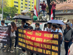 Aksi tersebut berlangsung dalam ketegangan tinggi. Massa mengepung gerbang Mabes Polri sambil membawa poster bertuliskan: “Hukum Jangan Buta di Binjai!” dan “Presiden Harus Turun Tangan!”