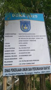 Beberapa bulan ini saja, sudah terlihat retak-retak air. Yang terkesan pekerjaan pelaksanaan proyek itu, disinyalir asal-asalan jadi saja. Sesuai tampilan adanya plang papan nama nilai kontrak pekerjaan proyek tersebut, di tampilkan secara publik. Tertuliskan dan juga menyebutkan, doka 2025. Nomor kontrak, 19/sp/pupr/e-kat/doka/2025, pekerjaan. Lanjutan rehabilitas saluran sekunder gampong paya bujok seuleumak – ahmad yani (ayam tangkap-pemadam). Lokasi, kota langsa. Volume, 1 kegiatan. Nilai kontrak, Rp.935.008.275.00,- sumber dana. Doka 2025 kota langsa, tanggal mulai. 22 agustus 2025, tanggal selesai. 20 desember 2025, tahun anggaran 2025.