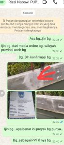 Melalui chat whatsapp selularnya, yang di sampaikan jafrian konfirmasi itu, yang di sebut-sebut sapaan panggilan “rizaldi nabawi”. Tentang, beberapa foto gambar yang telah di langsirkan ke chat whatsappnya itu. “Ass bg..ijin bg. Ijin bg..dari media online bg..wilayah provinsi aceh bg, Bg..Blh konfirmasi bg, Ijin bg…apa benar ini proyek bg punya..Bg..sebagai PPTK nya bg”, sebut wartawan media ini kepadanya. Terkirim ke chat whatsapp selularnya itu, jumat 25/12/2025 sekitar pukul.22.40.wib.