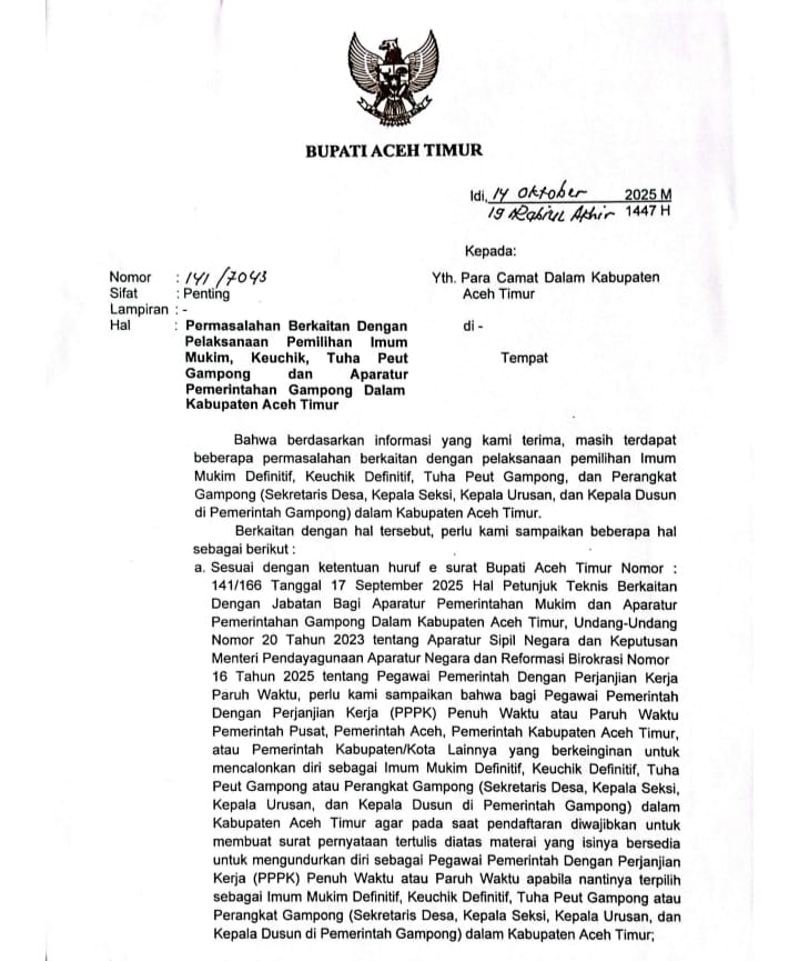 Berikut jawaban hasil yang telah di himpun informasi dari rekanan wartawan media ini juga, kamis 16 oktober 2025 sekitar pukul.20.21.wib di kabupaten aceh timur. Dengan adanya lembaran dokumen, dan juga adanya berdasarkan surat bupati aceh timur nomor : 141/7043. Tanggal 14 oktober 2026, dengan perihal : Permasalahan berkaitan dengan pelaksanaan pemilihan kmum mukim. Geuchik, tuha peut gampong. Dan aparatur pemerintahan gampong, dalam kabupaten aceh timur. Jelas di tuliskan, adanya beberapa poin. Terkait rangkap jabatan PPPK (P3K) paruh waktu di aceh timur, berikut penjelasannya : Sesuai dengan ketentuan huruf e surat bupati aceh timur, nomor:141/166. Tanggal 17 september 2025, hal petunjuk teknis berkaitan dengan jabatan.