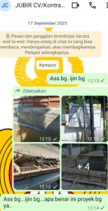 Pada hal, tujuan wartawan media ini juga. Hanya sebatas konfirmasi terkait, adanya pelaksanaan pekerjaan kegiatan proyek yang telah terlaksana itu. Parahnya lagi, apa yang di sampaikan oleh oknum PPTK dengan sapaan panggilan “icak” itu. Dan wartawan media online ini juga melanjuti, untuk melakukan konfirmasi kepada dengan sebutan sapaan panggilan “jubir cv” melalui chat whatsapp selularnya itu. Di nomor selularnya,.085206xxxx66. Menyampaikan kepadanya itu, “jubir cv” Ass bg..ijin bg, Ass bg…ijin bg…apa benar ini proyek bg ya…Dan konfirmasi itu terkirim kepadanya, kamis 23/10/2025 sekitar pukul.12.14.wib. Namun nomor kontak selular chat whatsappnya, sapaan panggilan “jubir cv” tersebut. Tidak aktif, dan pula sampai pemberitaan ini. Di terbitkan secara publik pada media online ini, masih belum ada jawaban apa pun.