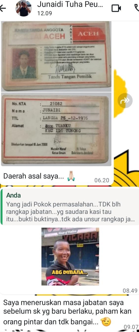 Dirinya ada melangsirkan sebuah lembaran kartu tanda anggota partai politik (partai aceh) wilayah kabupaten aceh timur kepada wartawan media online ini juga, yang terkesan pula. Dirinya menunjukan taring kehebatannya kepada wartawan media ini. Ketika wartawan media online ini juga, sempat menerima langsiran dari salah satu oknum P3K kantor dinas wilayatul hisbah (w.h) pemkab aceh timur. Yang disebut-sebut sapaan panggilan “junaidi”, yang juga merangkap jabatan sebagai anggota tuha peut desa gampong baro kecamatan langsa lama kota langsa. Melalui seluler chat whatsappnya itu, di nomor 085261xxxx37. Yaitu berupa foto gambar KTA partai aceh dan juga tambahan komentarnya, kepada wartawan media ini.