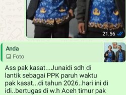 Berikut pula, pihaknya dinas terkait tersebut. Sempat pernah di komentari oleh kasat pol pp dan w.h pemerintahan kabupaten aceh timur, kini junaidi itu telah di syah kan sebagai pegawai PPPK paruh waktu. Kenapa kasat pol pp dan w.h aceh timur, kok belum ada tindakan. Ada apa, kenapa kok diam saja”. Tuturnya, sumber berinisial “alm” itu. Kemarin, jumat 23/01/2026 sekitar pukul.14.56.wib.