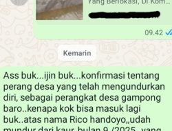 “Ass buk…ijin buk…konfirmasi tentang perang desa yang telah mengundurkan diri, sebagai perangkat desa gampong baro..kenapa kok bisa masuk lagi buk..atas nama Rico handoyo,,udah mundur dari kaur, bulan 9 /2025,,,yang juga dugaan pernah mengelola/menipu dengan geuchik mahdi buk..Ijin buk..kenapa kok bisa terjadi buk, Ijin buk…jawabannya kembali buk”, sebut wartawan media ini kepadanya ibu Pj geuchik “Elsa” yang di sampaikan. Dan ulasan konfirmasi itu juga terkirim di nomor selularnya, 082365xxxx14. Kemarin itu juga, 20/01/2025 sekitar pukul.12.25.wib.