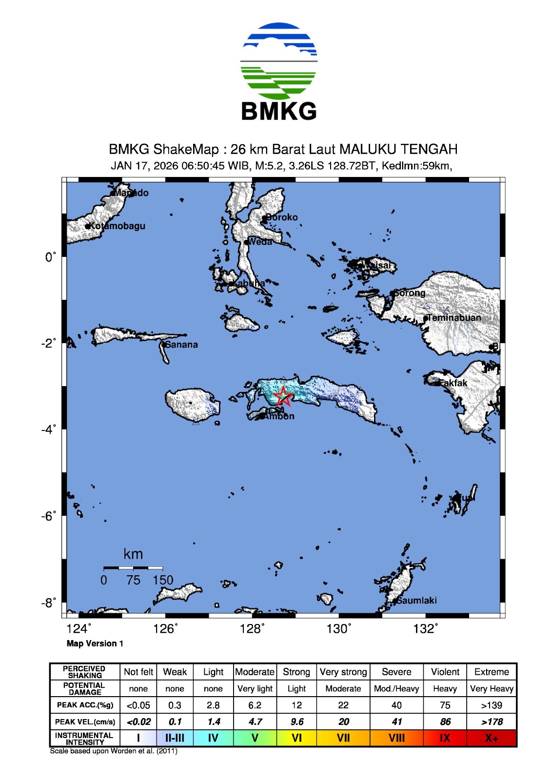Jakarta |detektifinvestigasigwi.com- Pada hari sabtu 17 januari 2026 pukul 06.50.44 WIB wilayah Maluku Tengah, Maluku diguncang gempa tektonik. Hasil analisis BMKG menunjukkan gempa bumi ini memiliki parameter update dengan magnitudo M5,2. Episenter gempabumi terletak pada koordinat 3,26° LS ; 128,72° BT, atau tepatnya berlokasi di *darat* 26 km barat laut Maluku Tengah, Maluku pada kedalaman 59 km.