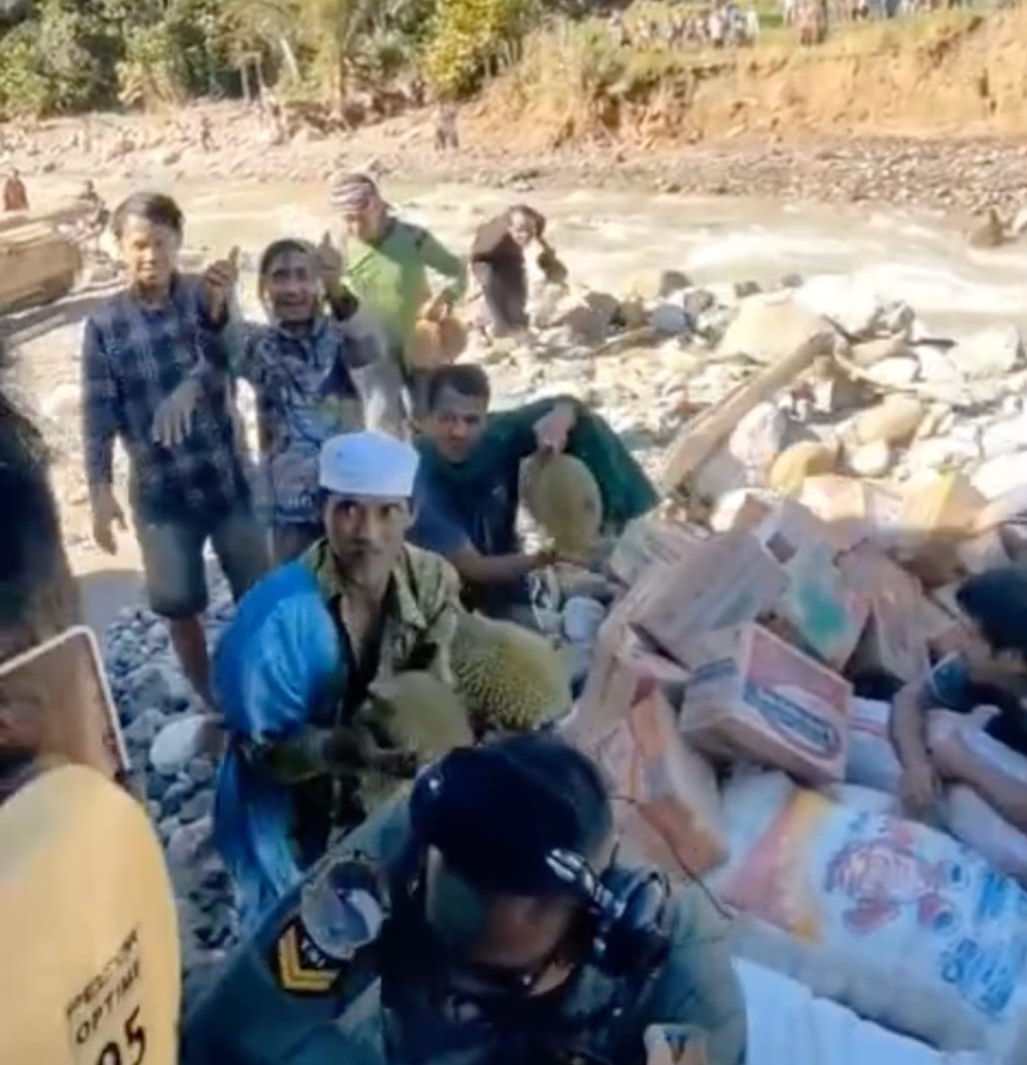 Usai helikopter mendarat dan proses penurunan logistik selesai, terjadi momen yang menghangatkan hati. Sejumlah warga mendekat, membawa beberapa butir durian, lalu menyerahkannya kepada awak helikopter. Tanpa banyak kata, pemberian sederhana itu menjadi ungkapan terima kasih atas bantuan yang telah sampai.