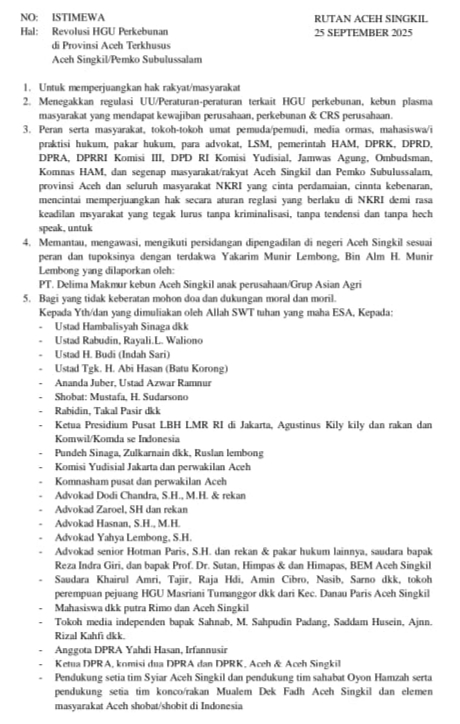 Kini saatnya pemerintah pusat, pemprov aceh. Penegak hukum, dan masyarakat sipil. Bersatu mengawasi dan membongkar pelanggaran HGU, yang selama ini. Di sembunyikan, di balik meja dan dokumen formalitas.