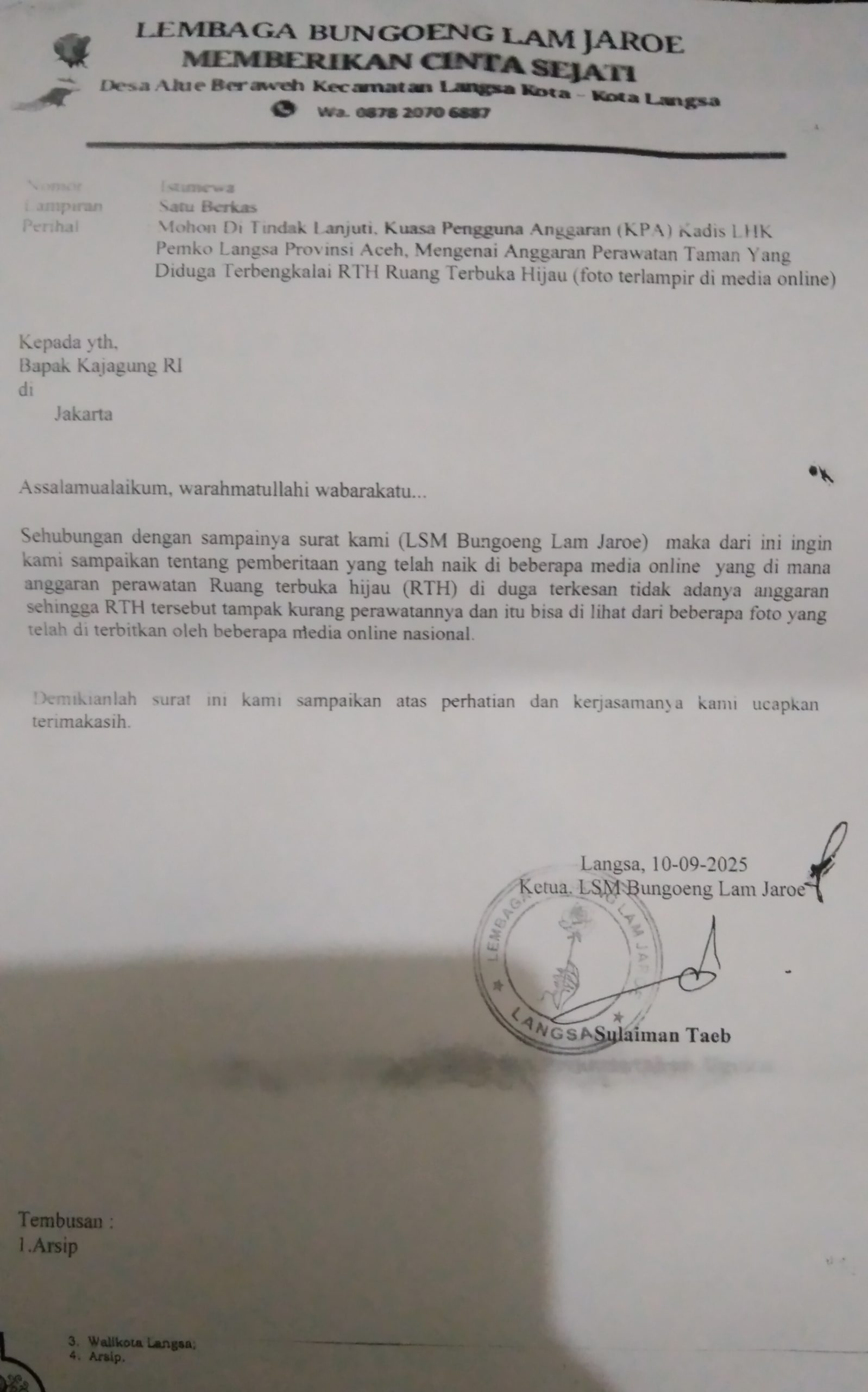Menjelaskan, dengan tujuan. Kepada yang terhormat (yth), bapak kajagung-ri. “Assalamualaikum warahmatullahi wabarakatuh, sehubungan dengan sampainya surat kami (LSM Bungoeng Lam Jaroe). Maka dari ini, ingin kami sampaikan tentang pemberitaan. Yang telah naik, di beberapa media online. Yang di mana, anggaran perawatan ruang terbuka hijau (RTH). Diduga terkesan tidak adanya anggaran, sehingga RTH tersebut. Tampak kurang perawatannya, dan itu bisa di lihat dari beberapa foto yang telah di terbitkan oleh beberapa media online tersebut. Demikian lah, surat ini. Kami sampaikan, atas perhatian dan kerjasamanya kami ucapkan terima kasih”. Sebutnya, dalam isi surat itu. Langsa, 10/09/2025. Ketua lsm bungoeng lam jaroe, di tanda tangani dan berstempel basah “Sulaiman Tabe”. Tembusan, – arsip.
