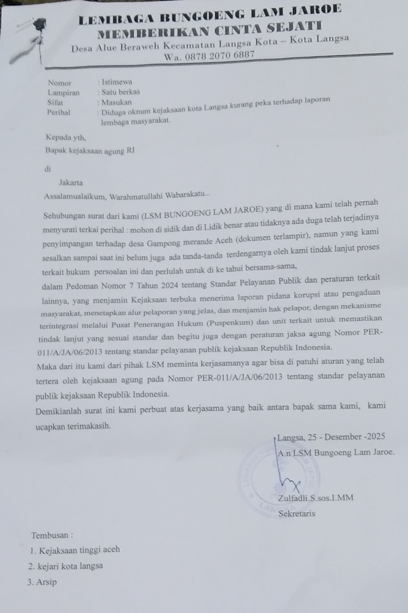 Di buat langsa, 25 desember 2025. Atas nama (a.n) lsm bungoeng lam jaroe, “zulfadli s sos i mm” sekretaris. Dengan adanya tembusan : 1, kepala kejaksaan tinggi aceh. 2, kepala kejaksaan negeri kota langsa. 3, arsip. Dikirim melalui via jasa pengiriman barang J&T daerah kota langsa, dan sebagai penerima. Bapak kepala kejaksaan agung ri, jakarta kebayoran baru. Dengan nomor berkode/resi, JD0525309305. Tertanggal pengirim, 25/12/2025.