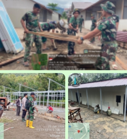 Pantauan di lapangan memperlihatkan pekerjaan di beberapa titik berjalan dalam berbagai tahapan, mulai dari pemasangan rangka konstruksi, pemasangan panel atau dinding, hingga penataan area kerja di sekitar bangunan huntara.