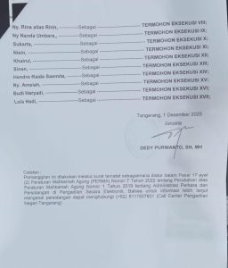 Telah dikabulkannya Permohonan Aanmaning/ Eksekusi oleh ketua pengadilan Negeri tangerang dengan nomor eksekusi no. 101/PEN.EKS/2025 PN. TNG Jo. No 149/Pdt.G/2021 PN. Tng Jo No 240/PDT/2022/PT.BTN Jo No.4521K/PDT/ 2023 Berkekuatan Hukum Tetap.yang di tanda tangani oleh ketua pengadilan negeri Tangerang tanggal 26 November 2025 dan undangan dari Jurusita pengadilan negeri Tangerang untuk memanggil para termohon eksekusi yaitu Relaas Panggilan Tegoran/Aanmaning.hari kamis Tanggal 11 Desember 2025 pukul 10,00 WIB di kantor pengadilan Negeri Tangerang .