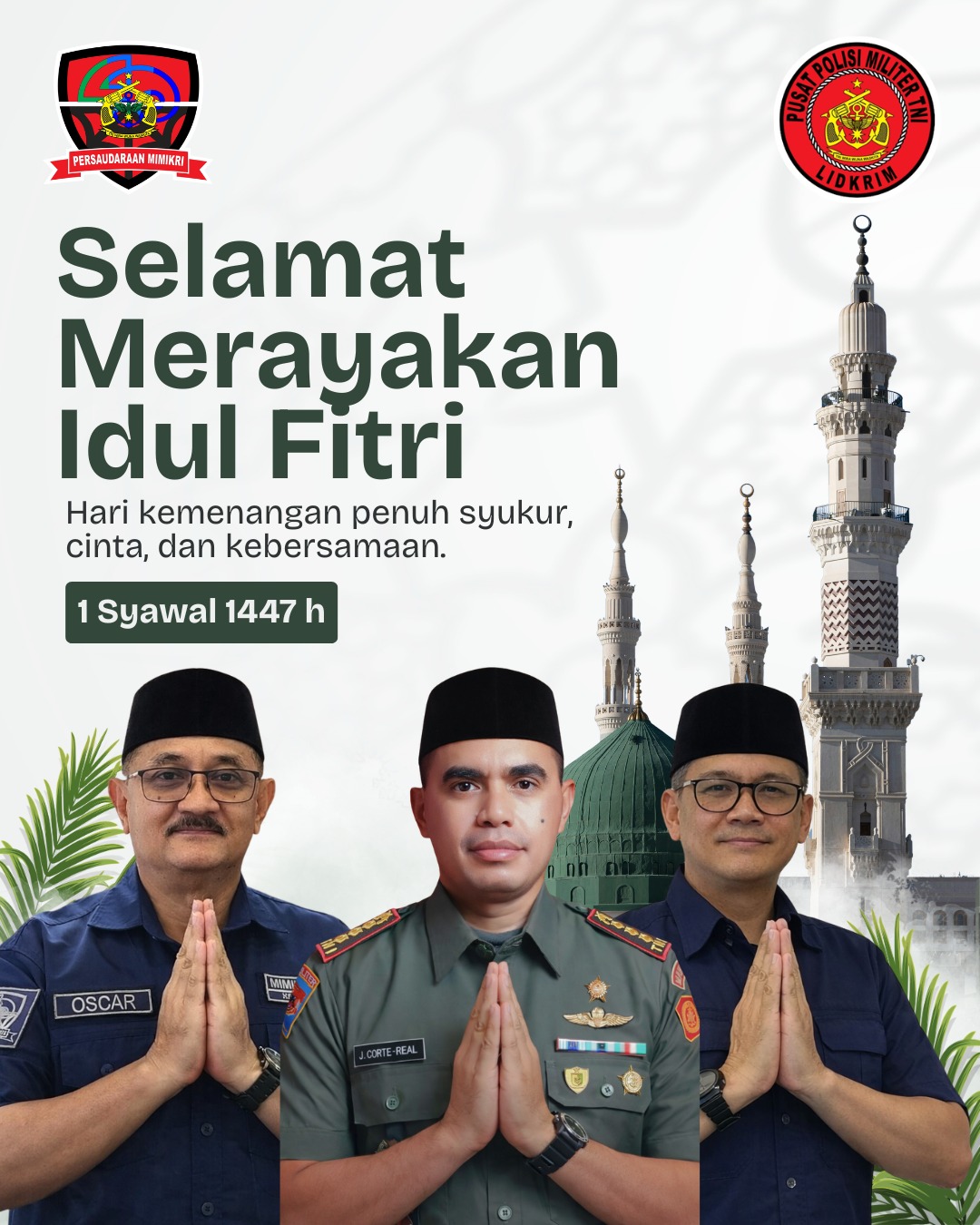 Jakarta, ditektufinvestigasigwi.com — Dalam momentum perayaan Hari Raya Idul Fitri 1447 Hijriah, Persaudaraan Mimikri bersama Pusat Polisi Militer Tentara Nasional Indonesia (Puspom TNI) menyampaikan ucapan selamat kepada umat Muslim di seluruh Indonesia. Ucapan tersebut disampaikan melalui pernyataan resmi yang dipublikasikan di berbagai platform media.