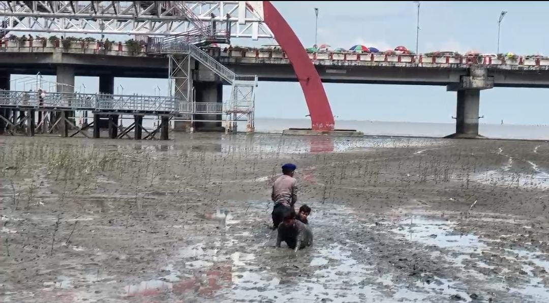 Dalam patroli rutin tersebut, petugas berhasil menyelamatkan dua orang anak yang terjebak di area lumpur tebal akibat kondisi air laut yang sedang surut.Kejadian bermula saat kedua anak tersebut bermain terlalu jauh ke arah laut yang sedang surut, hingga akhirnya terjebak di tengah lumpur yang sangat dalam dan tidak mampu menggerakkan kaki mereka.