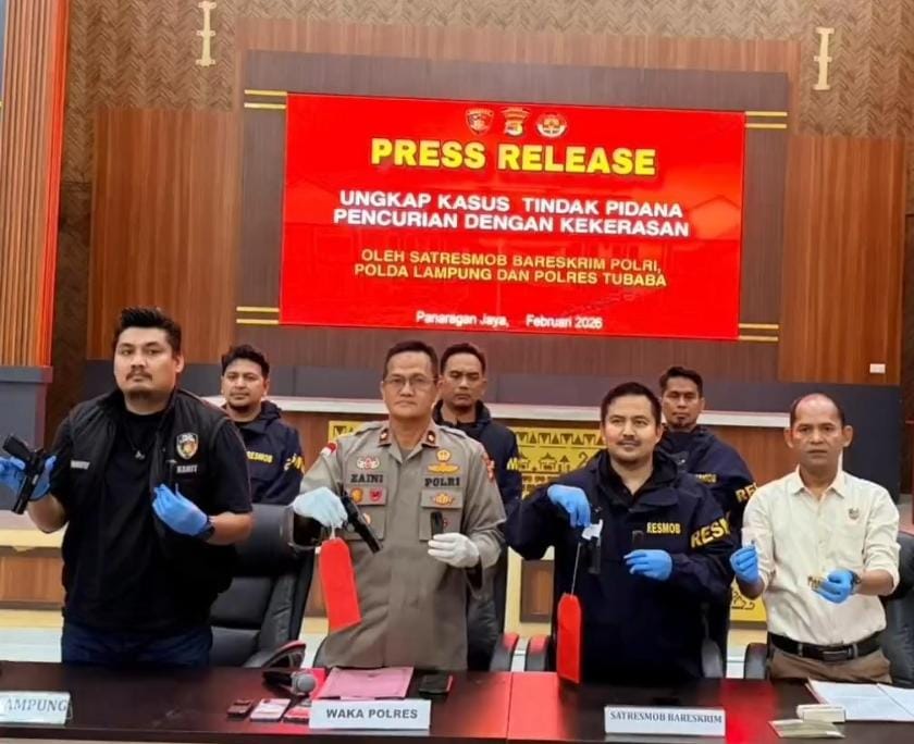 Lampung, ditektifinvestigasigwi.com – Tim Satresmob Bareskrim Polri bersama Polda Lampung dan Polres Tulang Bawang Barat berhasil mengungkap kasus pencurian dengan kekerasan (curas) menggunakan senjata api yang terjadi di Kabupaten Tulang Bawang Barat, Lampung, Kamis (20/2/2026).
