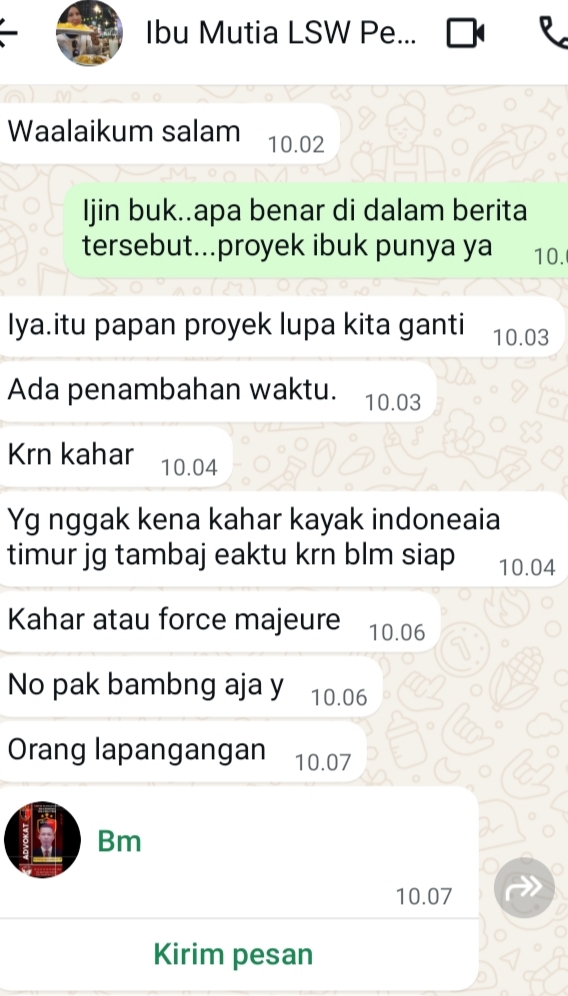 Menjelaskan, “Waalaikum salam, Iya.itu papan proyek lupa kita ganti. Ada penambahan waktu, Krn kahar. Yg nggak kena kahar kayak indoneaia timur jg tambaj eaktu krn blm siap, Kahar atau force majeure. No pak bambng aja y, Orang lapangangan”, ujarnya “mutia” tersebut. Kepada wartawan media online ini, bahkan juga di tambah kembali. Dirinya melangsir nomo kontak yang di sebut-sebut olehnya itu,”Bambang”. Di langsirkan olehnya,kepada wartawan media ini. Pada saat itu juga, sekitar pukul.10.07.wib.