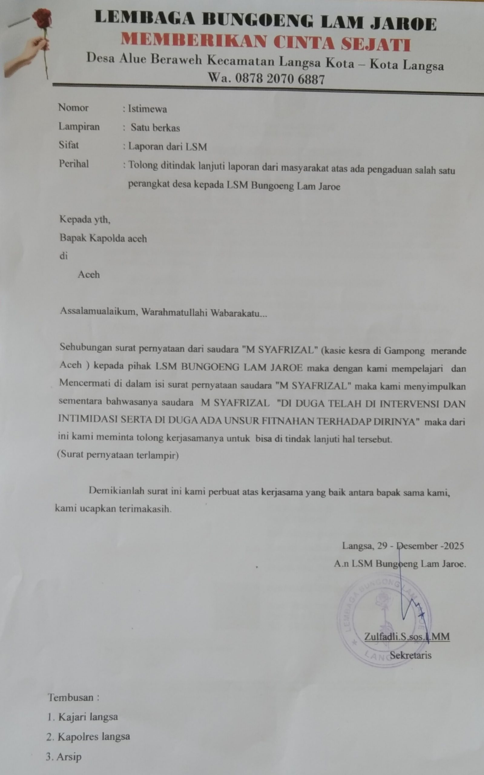 Yang berbunyi dalam surat tersebut, yaitu. Nomor : Istimewa, lampiran : Satu berkas, sifat : Laporan dari lsm, perihal : Tolong, ditindak lanjuti. Laporan dari masyarakat, atas adanya pengaduan salah satu perangkat desa kepada lsm bungoeng lam jaroe aceh di kota langsa. Di tujukan, kepada yang terhormat (yth) bapak kapolda aceh dan bapak kapolres langsa. Di perbuat, langsa 29 desember 2025. Atas nama (a.n) LSM bungoeng lam jaroe, sekretaris “zulfadli s sos i mm”. Tembusan : 1, kajari langsa. 2, Kapolres langsa.