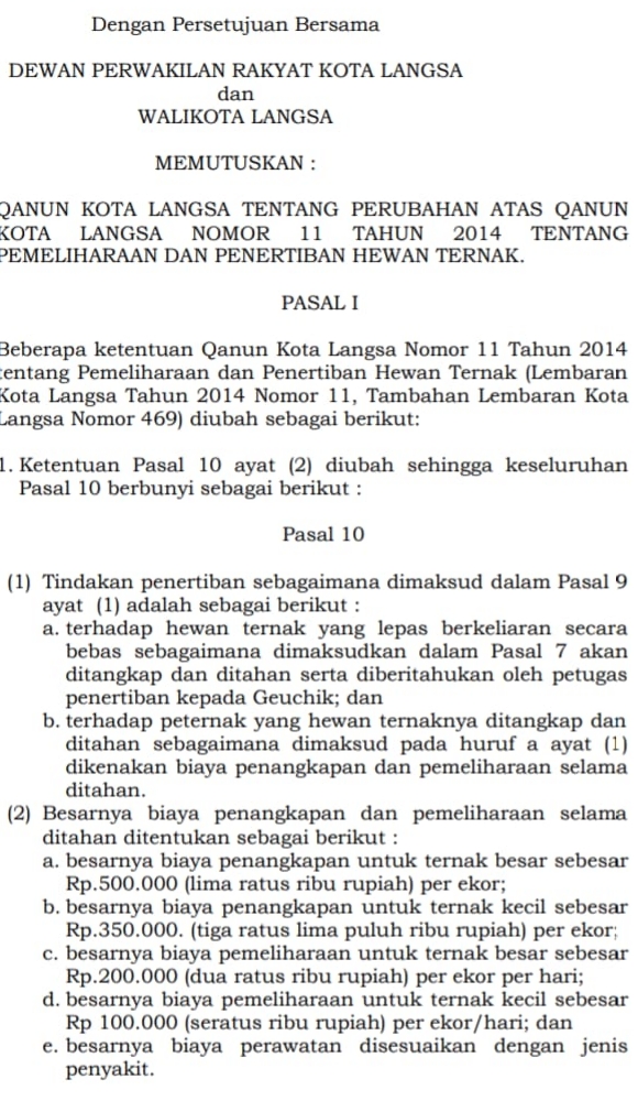 Langsa Nomor 469), diubah sebagai berikut : 1. Ketentuan Pasal 10 ayat (2) diubah sehingga keseluruhan, Pasal 10 berbunyi sebagai berikut : Pasal 10, (1) Tindakan penertiban sebagaimana dimaksud. Dalam Pasal 9 ayat (1). Adalah sebagai berikut : a. terhadap hewan ternak yang lepas berkeliaran secara bebas sebagaimana dimaksudkan, dalam Pasal 7. Akan